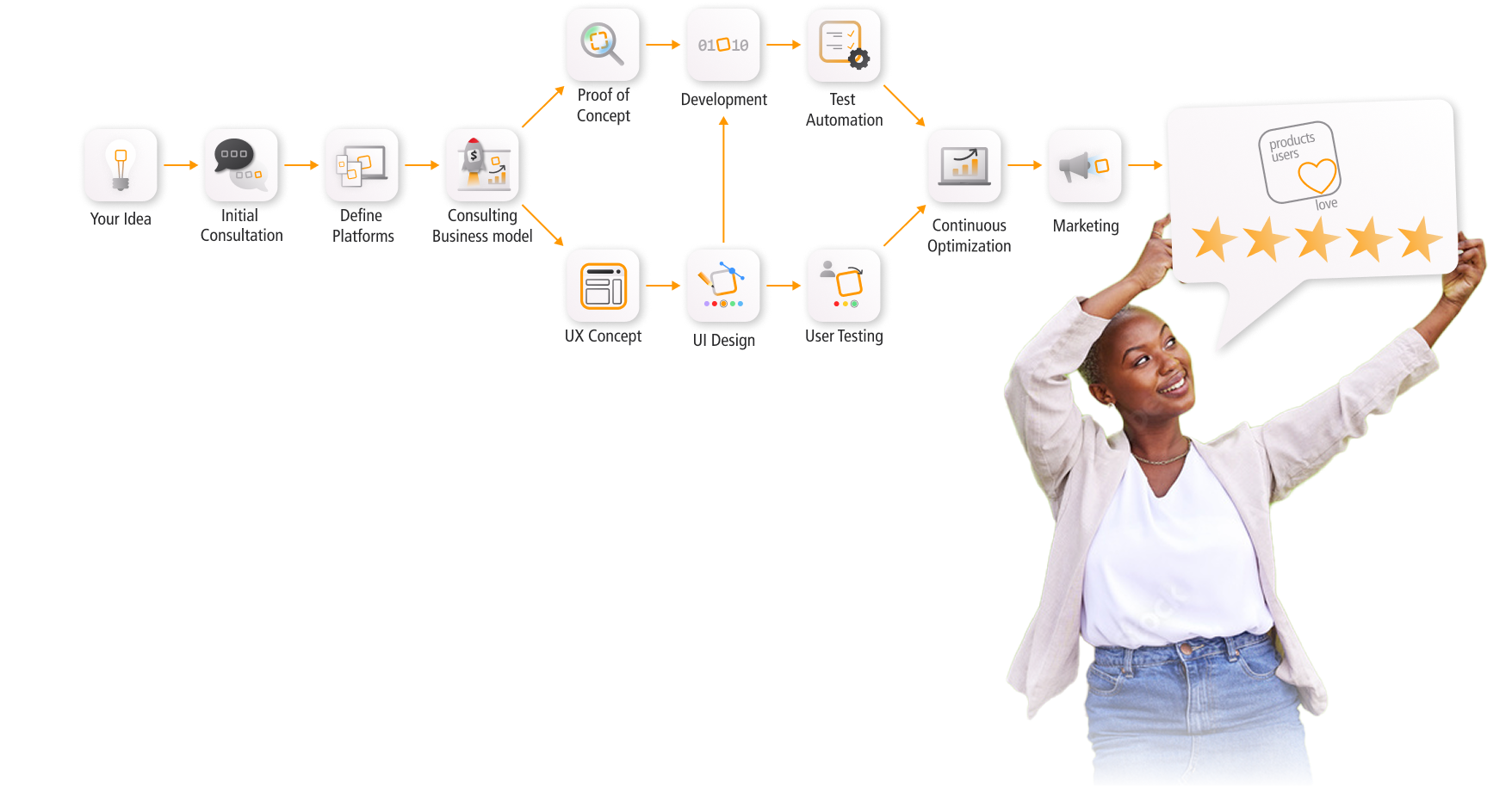 Whether it’s a (web) app, software solution, or digital business model – we analyze, challenge, and plan how to turn your idea into success.