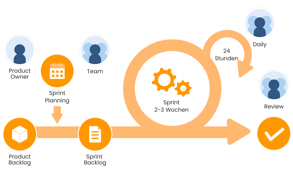 In kurzen Sprints werden vom Team iterativ Anforderungen an das Produkt aus dem Backlog umgesetzt und regelmäßig mit dem Product Owner abgestimmt.